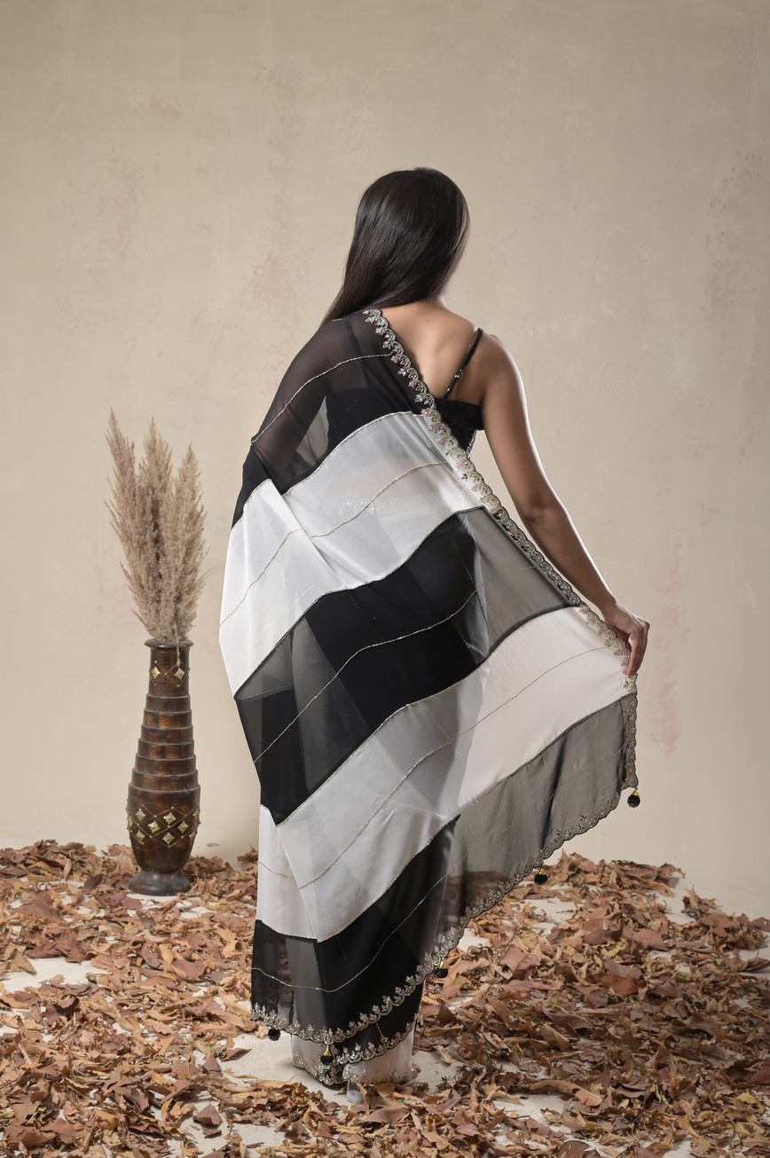Make a bold statement with our striking black and white organza saree. Delicate cutdana lines create a modern design, complemented by a classic black unstitched blouse.