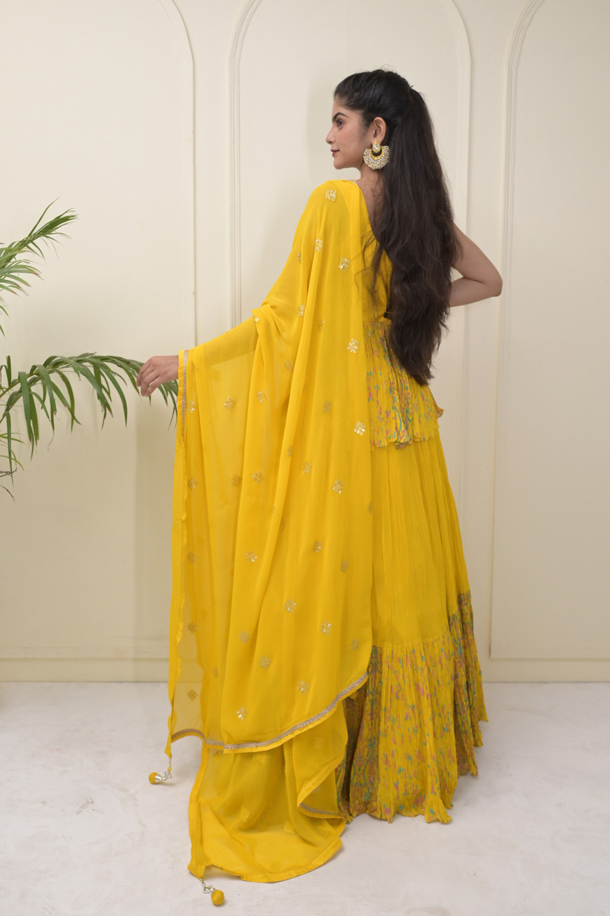 Yellow Floral Print Chinon Peplum Lehenga Set